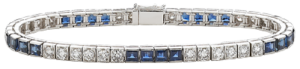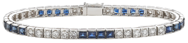 - Vivid, blue square-cut sapphires half-bezel set weighing 6.98cts