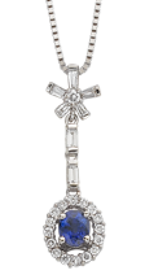 - Sapphire pendant with a .40ct oval sapphire surrounded by .21cts of round diamonds and .26cts baguette diamonds